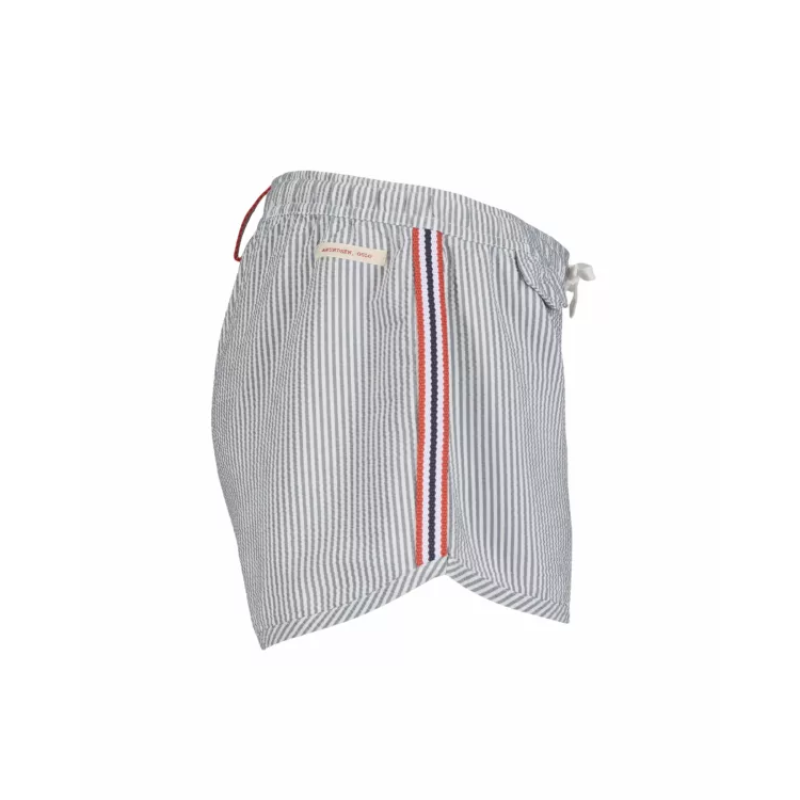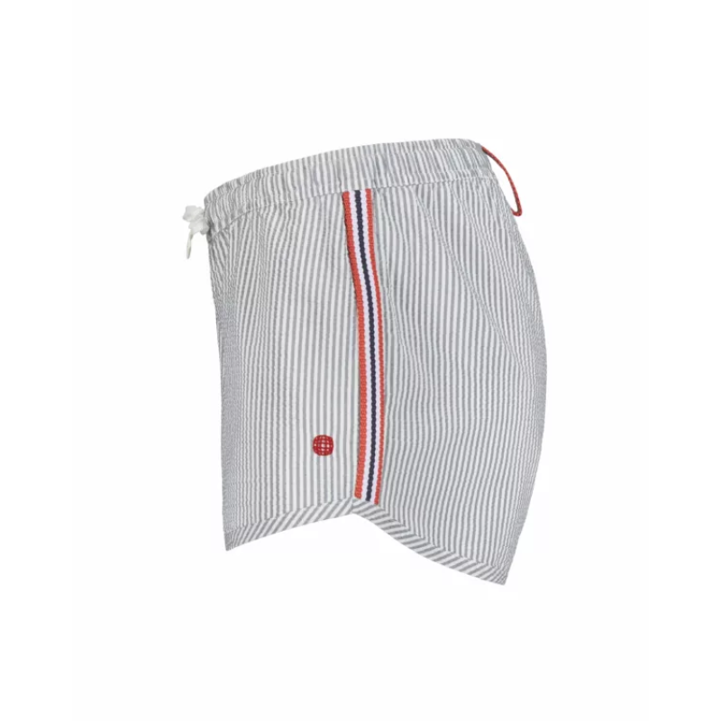 Som sommerens lekne ånd, bør badebukser ikke være for alvorlig. Med et nikk til den klassiske sommertids-«seersucker»-looken med vår klassiske Norgesreima-detalj. Seersucker-stoffet ser ut til å være rynket og er konstruert ved å trekke noen varpgarn strammere enn andre. Dette blir ofte referert til som slakk-spenningsveving, som er en prosess som er definert nøyaktig av tittelen. Når du bruker slakk-strekkvevingen, er resultatet et krøllete stoff som ser ut til å se rynket ut. Fordi det er rynket av naturen, er det ikke nødvendig å stryke stoffet og mange enkeltpersoner velger å pakke Seersucker-klær for ferier på grunn av dette.