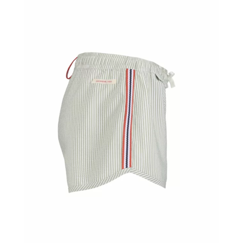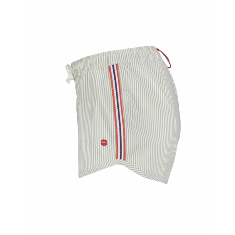Som sommerens lekne ånd, bør badebukser ikke være for alvorlig. Med et nikk til den klassiske sommertids-«seersucker»-looken med vår klassiske Norgesreima-detalj. Seersucker-stoffet ser ut til å være rynket og er konstruert ved å trekke noen varpgarn strammere enn andre. Dette blir ofte referert til som slakk-spenningsveving, som er en prosess som er definert nøyaktig av tittelen. Når du bruker slakk-strekkvevingen, er resultatet et krøllete stoff som ser ut til å se rynket ut. Fordi det er rynket av naturen, er det ikke nødvendig å stryke stoffet og mange enkeltpersoner velger å pakke Seersucker-klær for ferier på grunn av dette.
